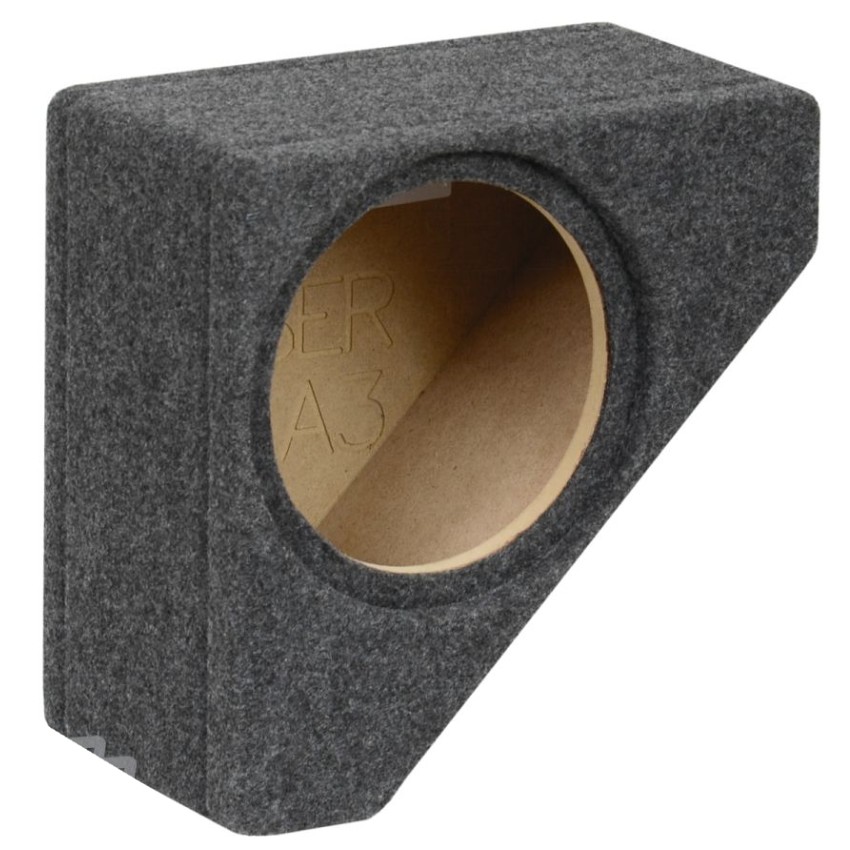 Pasklare subwooferbehuizing, vervaardigd van 18 mm MDF, gestoffeerd met grijs gemêleerde bekleding, voor de Audi A3 (type 8L)  1996 – 2003.